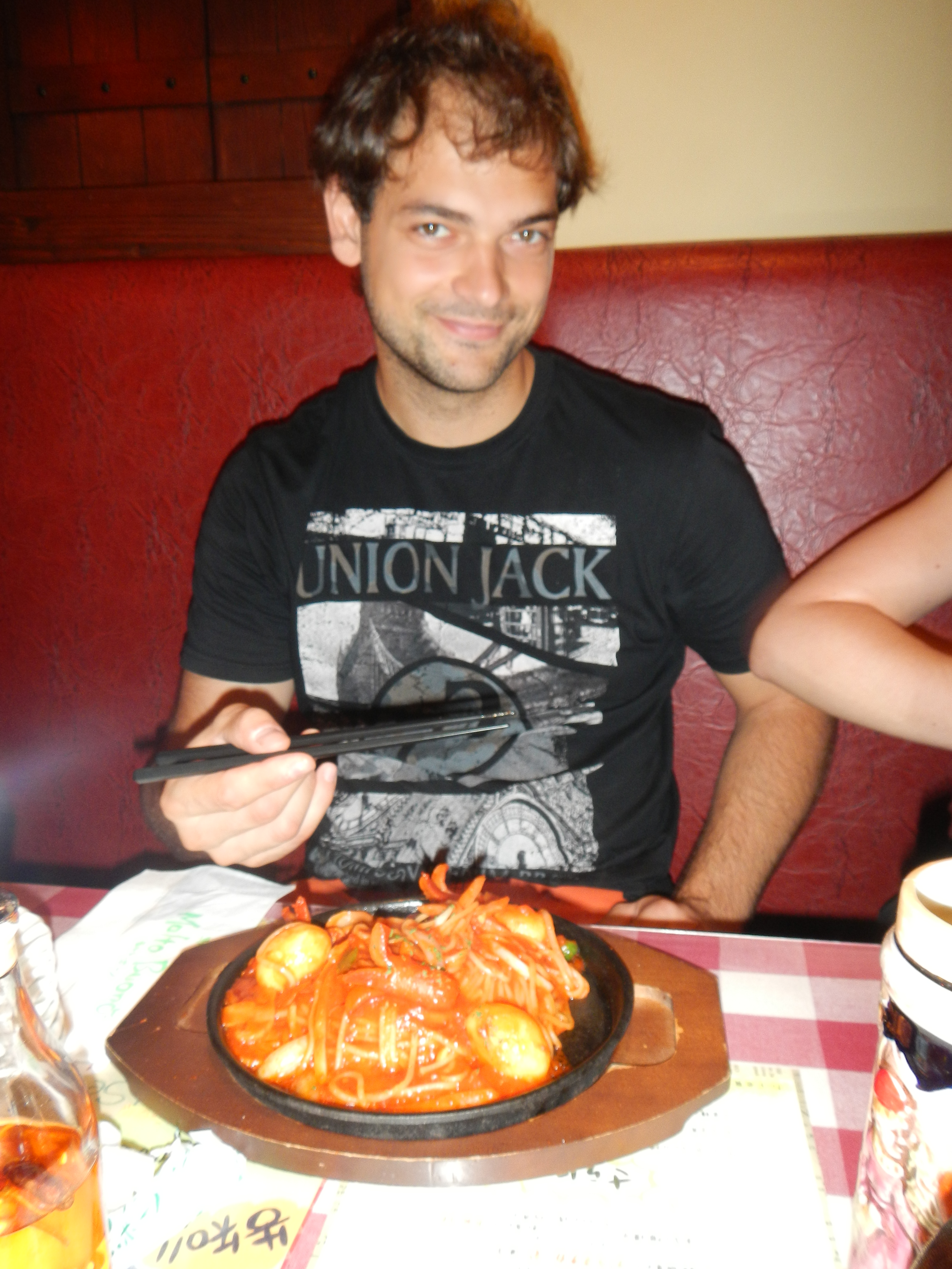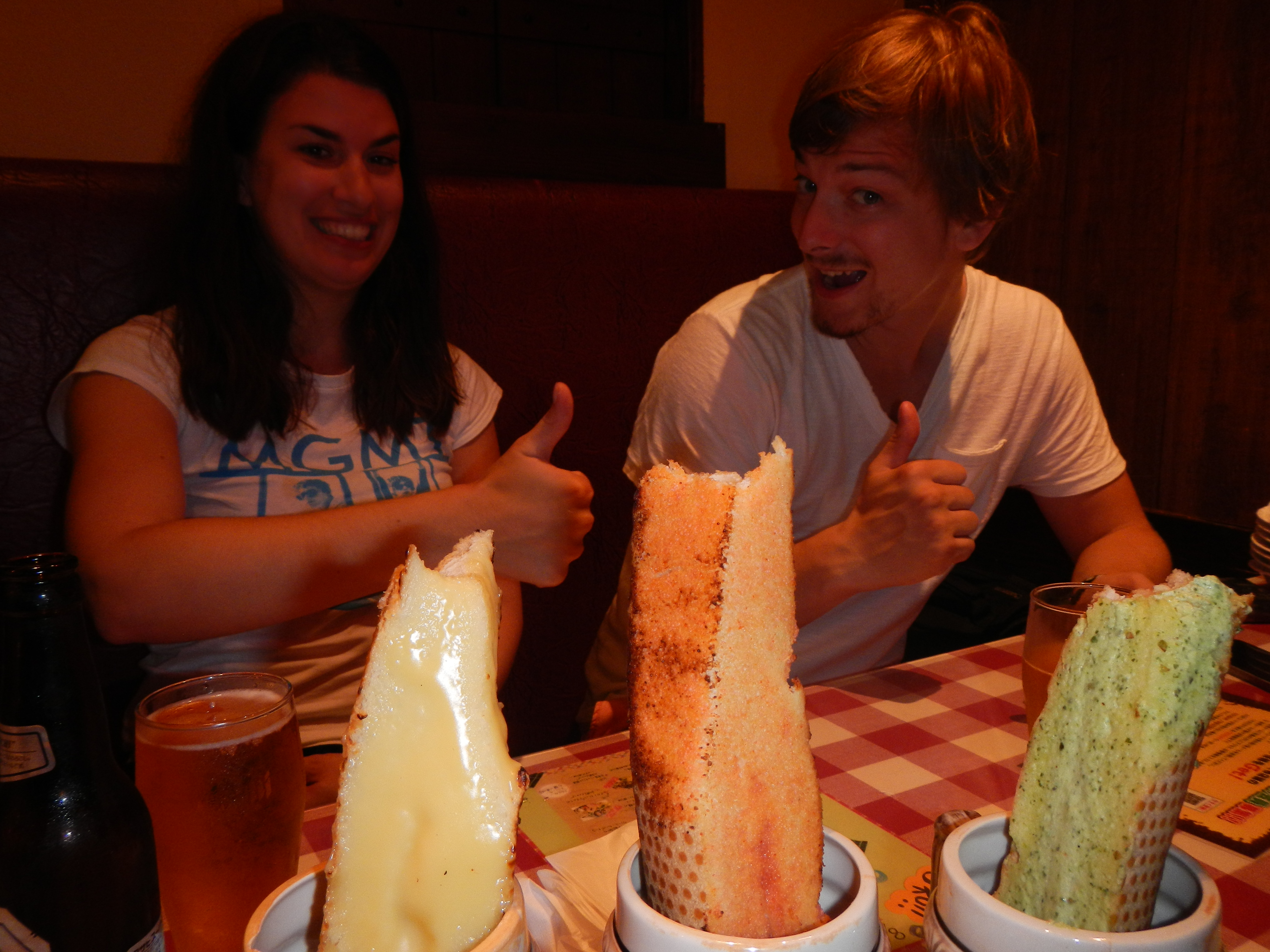 Abends gehn wir echt “gut” essen beim Italiener. Meine Pizza ist anstelle von Tomatensoße mit ganzen Zitronenscheiben ohne Schale belegt, mit Käse überbacken und in der Mitte mit fritierten Hühnchen bestückt. Die anderen Pizzen sind ähnlich abgefahren. Ausserdem, wer kennt es nicht, gibts als Beilage das traditionell Italienische “Longo Baguetto”. Ein Kräuterbutterbaguett im Masskrug aus Plastik nur anstelle von Kräuterbutter ist Pudding, Fischpaste, Apfelstrudel oder Pesto drin. So abartig wie es sich anhört, das mit Pudding ist das Beste!